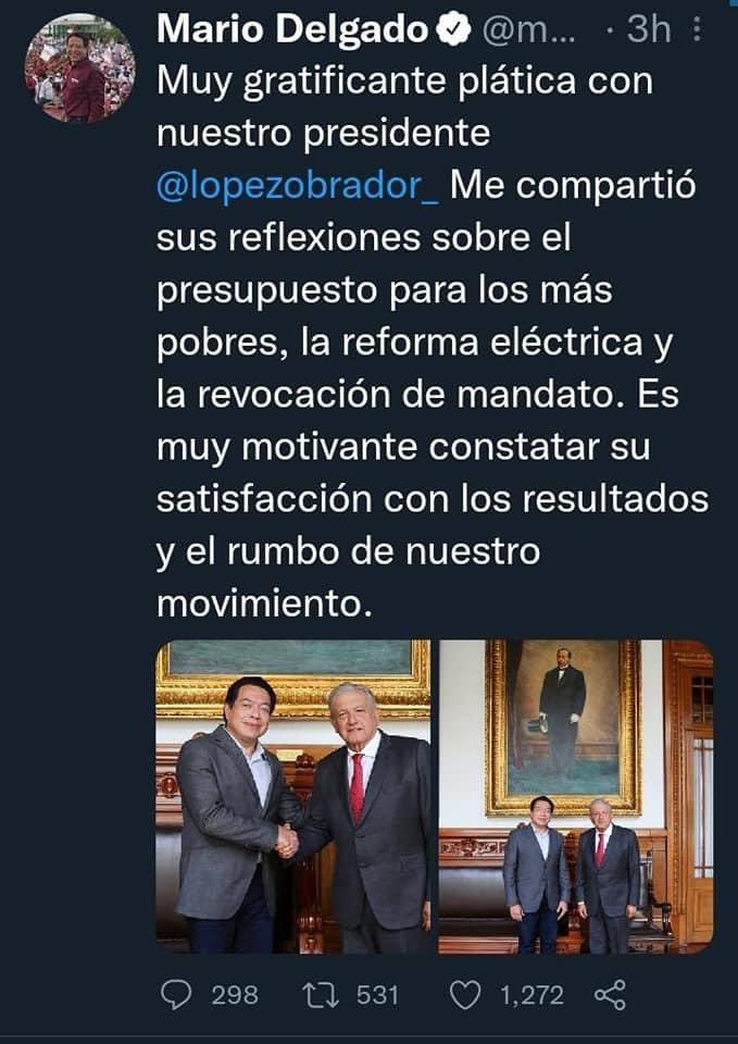 “Muy gratificante plática con nuestro presidente López Obrador. Me compartió sus reflexiones sobre el presupuesto para los más pobres, la reforma eléctrica y la revocación de mandato. Es muy motivante constatar su satisfacción con los resultados y el rumbo de nuestro movimiento”, dice el tuit de Mario Delgado.