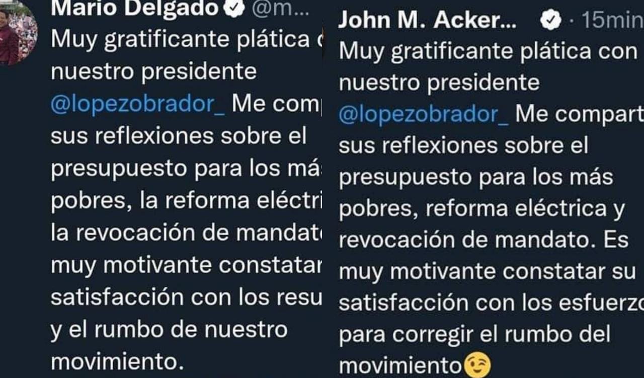 Mario Delgado, dirigente de Morena se reunió con el presidente Andrés Manuel López Obrador (AMLO) en Palacio Nacional. Pero no fue el único. Lo mismo hizo el académico y también simpatizante del partido, John Ackerman. Sin embargo lo que más llamó la atención es que ambos pusieron el mismo tuit tras sus respectivas reuniones. ¿Qué coincidencia, no?