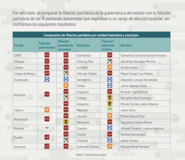 Apenas el viernes, la organización Laboratorio Electoral señaló en un reporte que al menos 16 políticos que aspiraban a un cargo de elección popular en el proceso electoral de 2 de junio próximo fueron asesinados entre el 4 de junio de 2023 y el 7 de febrero de este año. El reporte indicó 50 casos de violencia electoral, de los cuales 33 fueron asesinatos de políticos (16 buscaban algún cargo en los comicios en marcha), 11 atentados, cuatro secuestros o desapariciones y dos casos de amenaza grave.