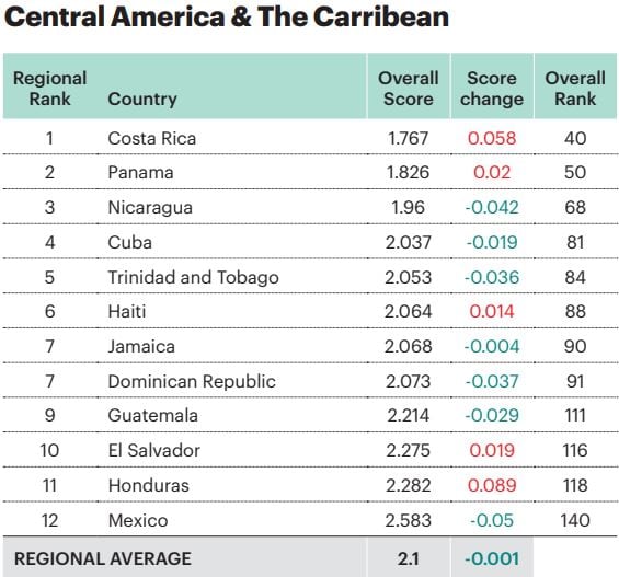 Pero las cifras apuntan que de los 12 países que componen la región de Centroamérica y el Caribe, México cuenta con el nivel más bajo de paz.