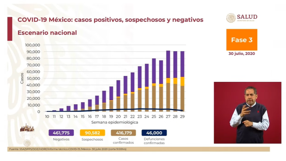 La Secretaría de Salud informó este jueves, que México sumó ya 416 mil 179 casos de Covid-19, así como 46 mil defunciones confirmadas.