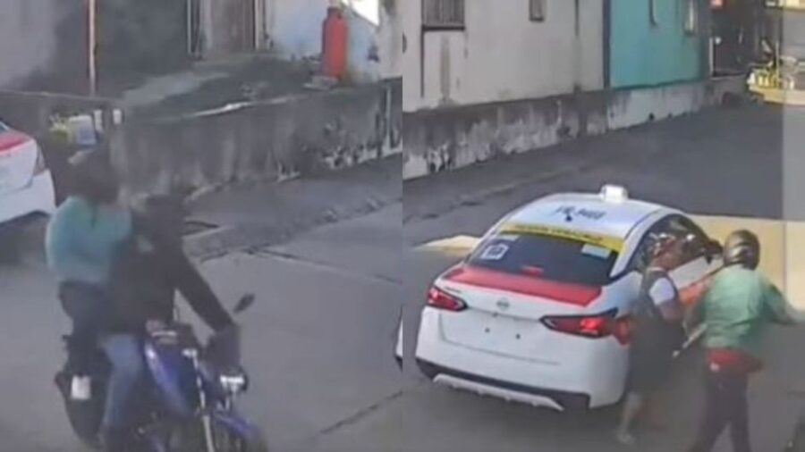 En las imágenes se observa a la mujer descender con dificultad de un taxi cuando, segundos después, dos hombres a bordo de una motocicleta se aproximan y la interceptan.