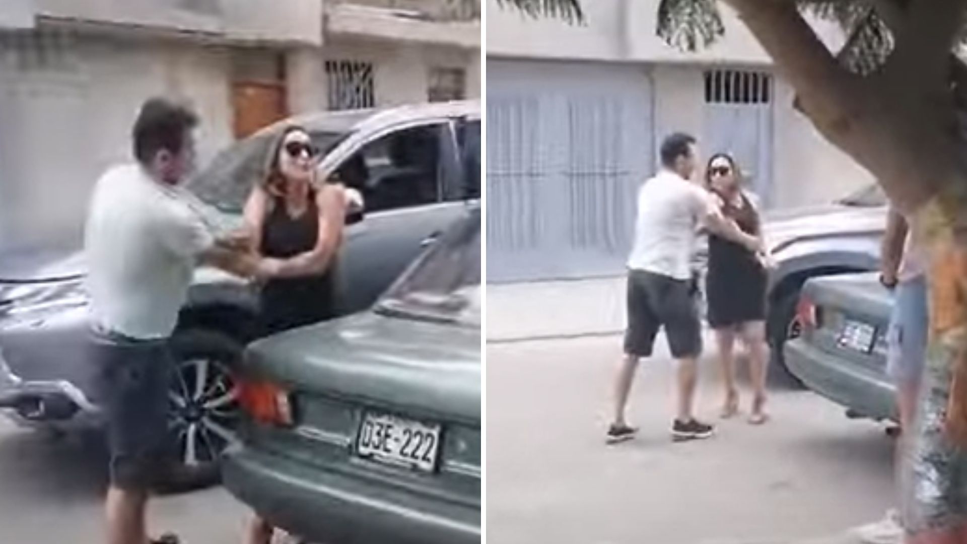 Ahí se ve cómo la mujer baja de su camioneta para enfrentar a su esposo y lo exhibe frente a la amante, quien se hace la que no sabe nada.