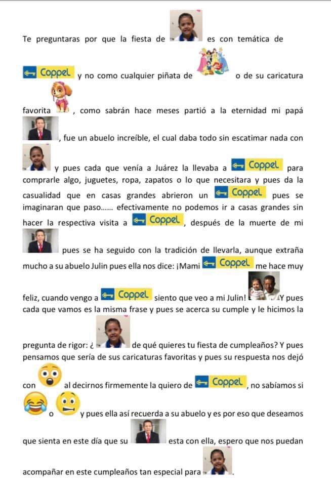 Un niña pidió para su cumpleaños una fiesta temática de Coppel. La razón del por qué quiso este tema fue porque le recuerda a su abuelito, quien falleciera hace unos meses. Él la llevaba a la tienda y le compraba cosas. La historia se ha viralizado.