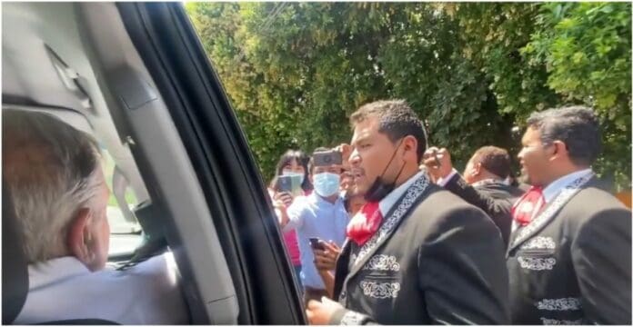 Un grupo de personas vestidas con trajes de mariachi se acercó este sábado al vehículo en el que viajaba el presidente Andrés Manuel López Obrador para interpretar una canción que lo menciona en reiteradas ocasiones y en la que piden bendiciones para él y el resto de gobernantes de México.