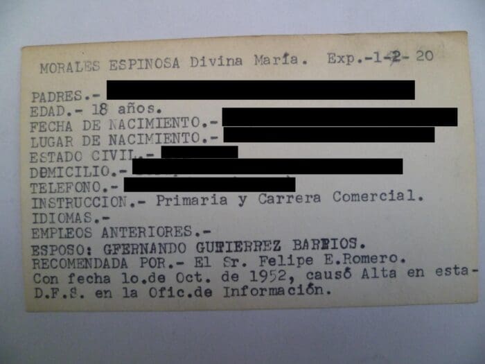 Otra persona que fue acreditada por la DFS fue la propia esposa de Gutiérrez Barrios, Divina María Morales Espinosa, cuando tenía apenas 18 años de edad.