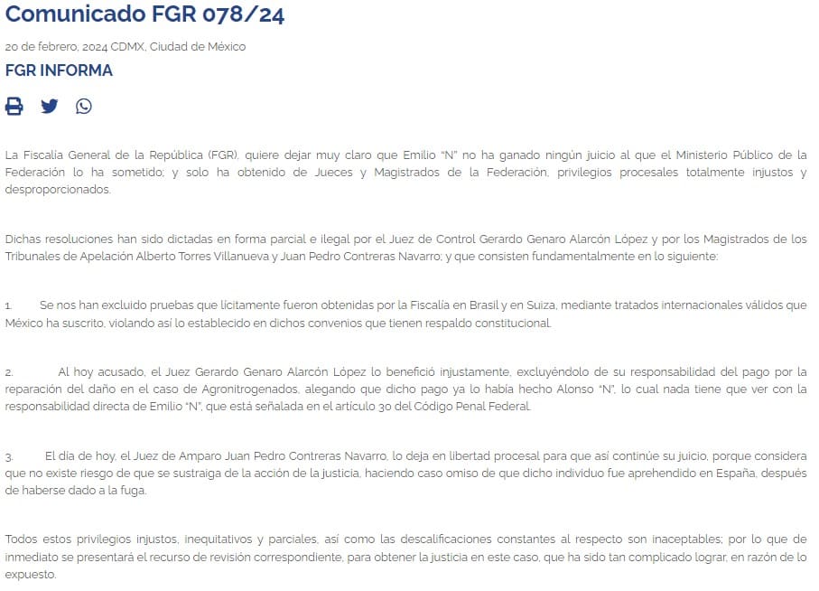 Por su parte, la Fiscalía General de la República (FGR) publicó un comunicado con el que “quiere dejar muy claro que Emilio ‘N’ no ha ganado ningún juicio”.