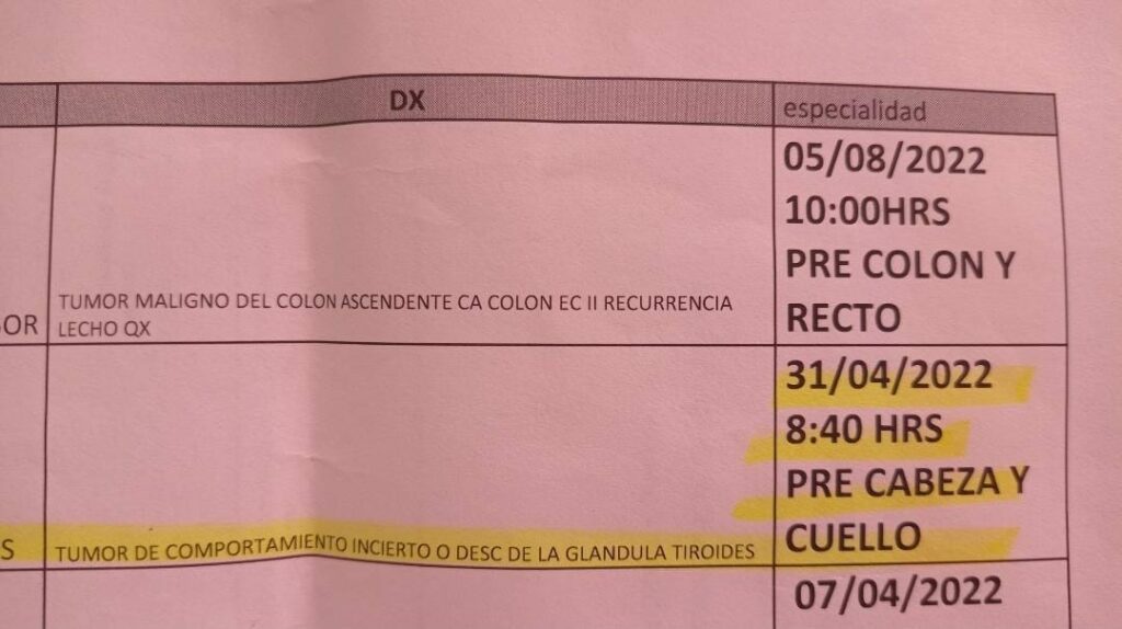 “El 1 de marzo mi oncóloga me mandó una biopsia guiada por USG, hice todos los trámites y después de un mes me dieron cita en siglo XXI para un día que no existe. Desde el 30 de marzo no me resuelve nada el IMSS“, dice el tuit de la denuncia, el cual viene acompañado de la foto donde podemos ver que le dieron una cita para el 31 de abril, día que no existe en el calendario del 2022, pues el mes tiene 30 días.