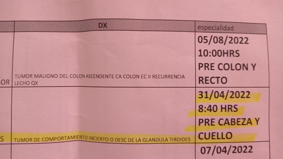 “El 1 de marzo mi oncóloga me mandó una biopsia guiada por USG, hice todos los trámites y después de un mes me dieron cita en siglo XXI para un día que no existe. Desde el 30 de marzo no me resuelve nada el IMSS“, dice el tuit de la denuncia, el cual viene acompañado de la foto donde podemos ver que le dieron una cita para el 31 de abril, día que no existe en el calendario del 2022, pues el mes tiene 30 días.