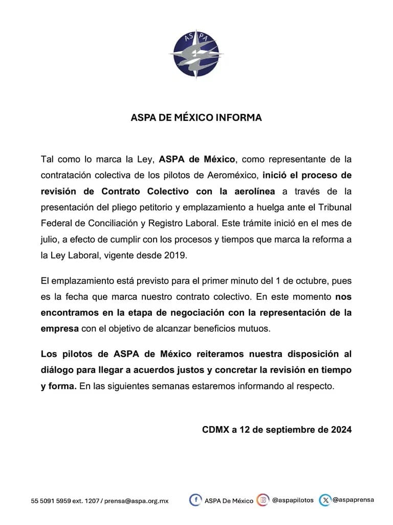 “Los pilotos de ASPA de México reiteramos nuestra disposición al diálogo para llegar a acuerdos justos y concretar la revisión en tiempo y forma. En las siguientes semanas estaremos informando al respecto”, finalizó el sindicato.