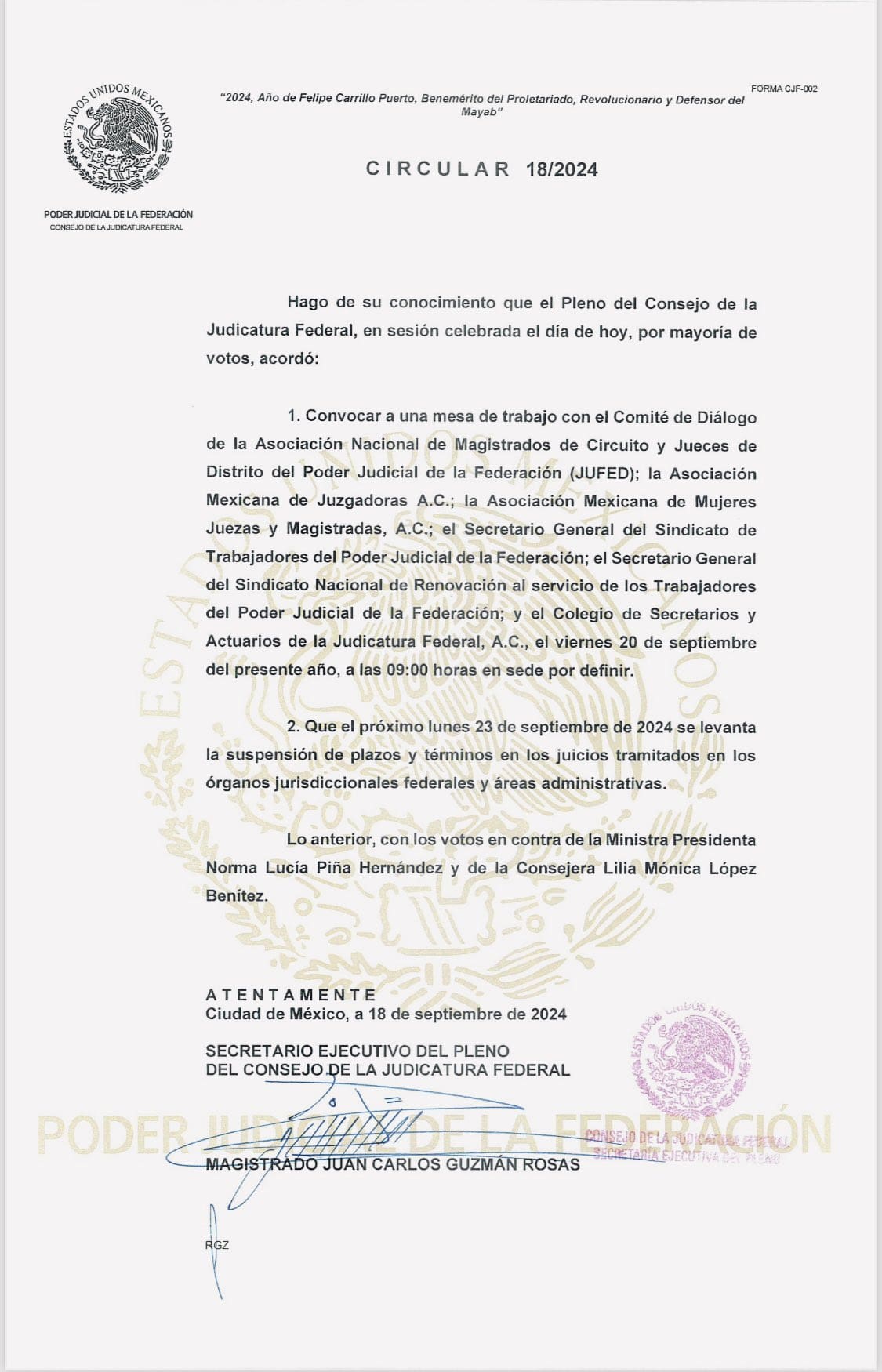 La resolución, publicada mediante una circular este miércoles, se dio con una votación de 5-2 en el Pleno del CJF.