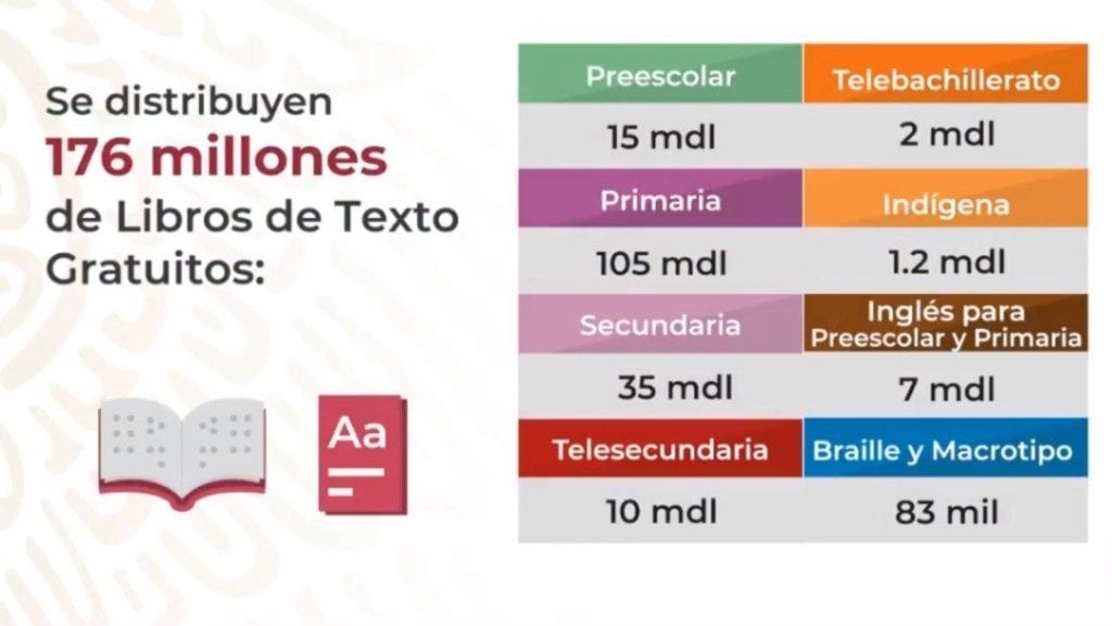 Moctezuma Barragán, destacó que durante este ciclo escolar se distribuyen 176 millones de libros de texto gratuito, lo que representa 96% del material. Mientras que el 4% restante, equivalente a 7 millones 40 mil libros, corresponden a libros que se imprimen de manera especial y no afectarán el ciclo escolar.
