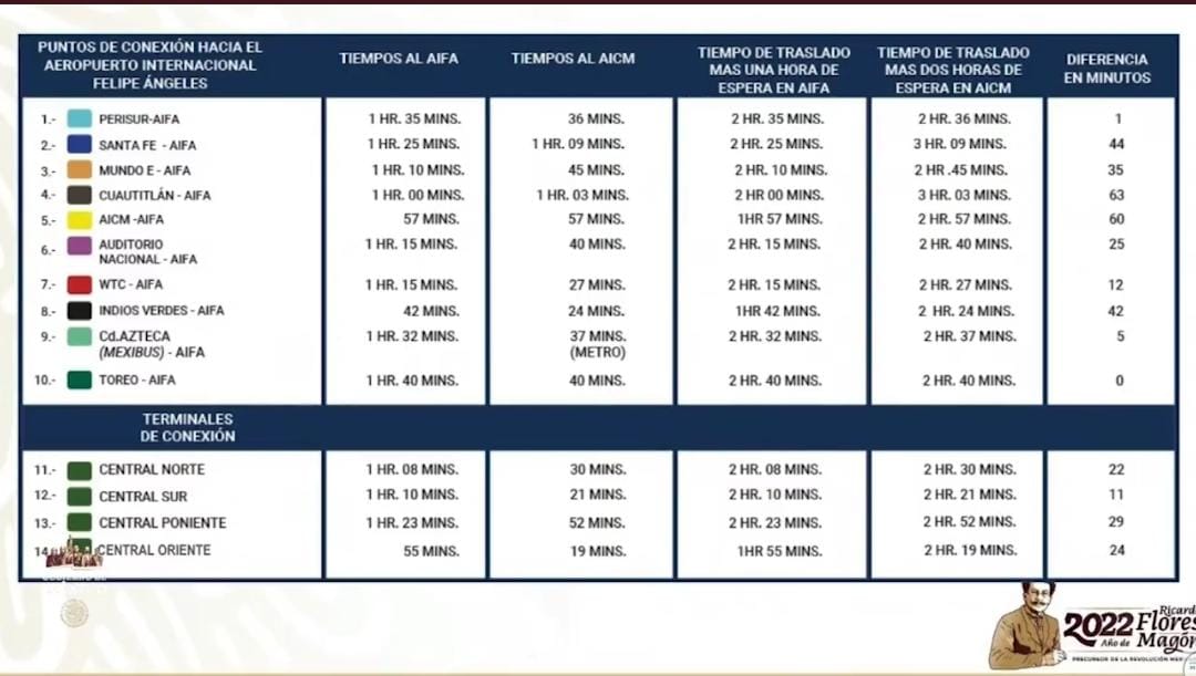 “Con los desarrollos tecnológicos que tiene el aeropuerto Felipe Ángeles la solicitud hacia los pasajeros va a ser que se encuentren una hora antes para los vuelos nacionales y dos horas antes para los internacionales. En ese sentido si hacemos los comparativos de los tiempos de espera en todos los casos con excepción de la ruta del Toreo, estamos con minutos a favor. Es decir el tiempo que se van a tardar en trasladarse al aeropuerto Felipe Ángeles será compensado con los tiempos de espera”, expusieron.