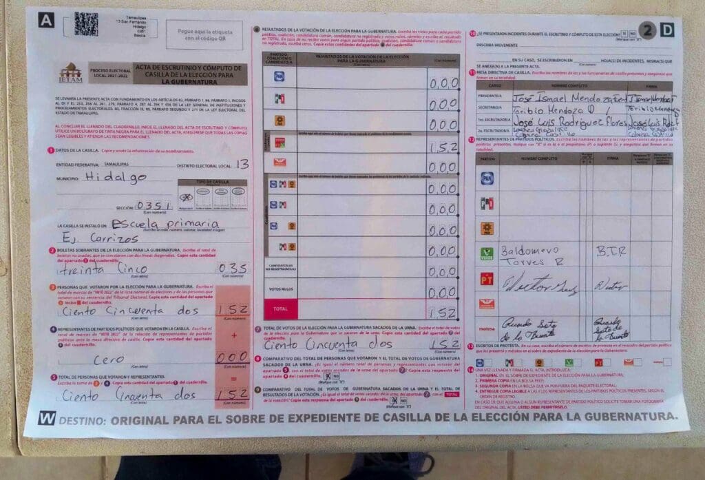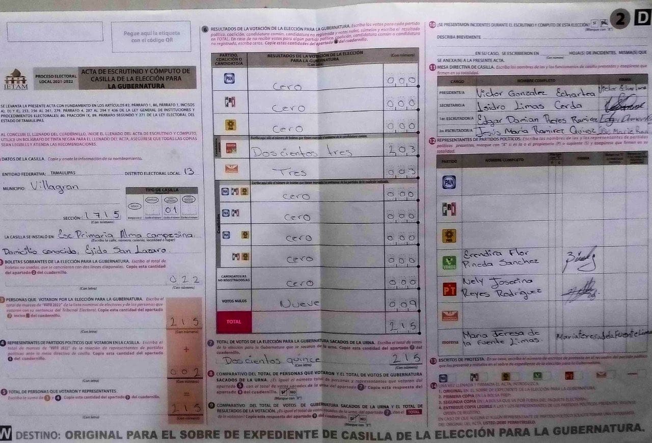 “Una acta más del municipio de Hidalgo, Tamaulipas donde el narco orquestó las elecciones y no permitió más que los representantes de Morena estuvieran en más de 70 casillas. Presidente López Obrador, acá las pruebas que reclama”, denuncia en un tuit Guadalupe Acosta Naranjo, militante perredista.