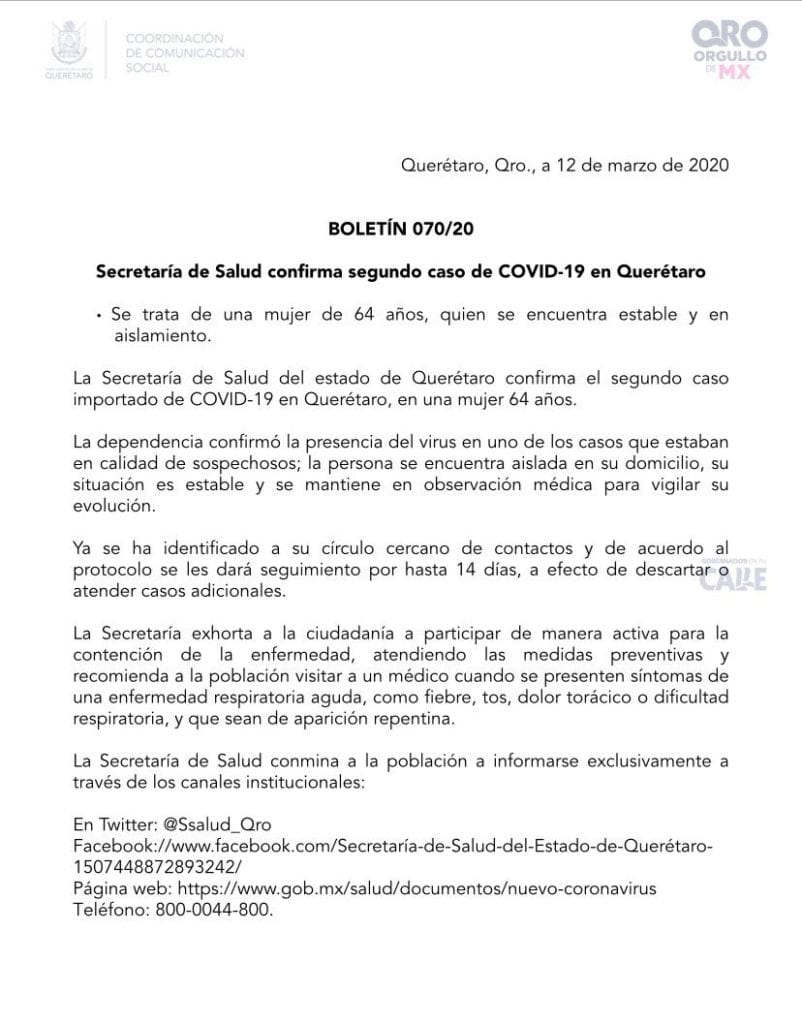A través de un comunicado, la Secretaría de Salud del estado de Quéretaro, confirmó un caso más de coronavirus, se trata de una mujer de 64 años de edad que se encuentra estable y aislamiento. Con este ya serían dos en la entidad y 13 en México de manera extraoficial.