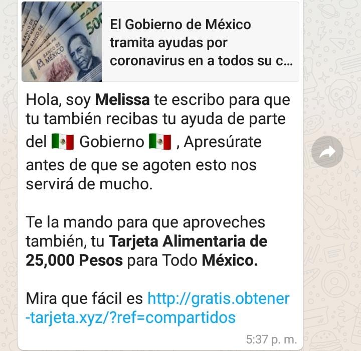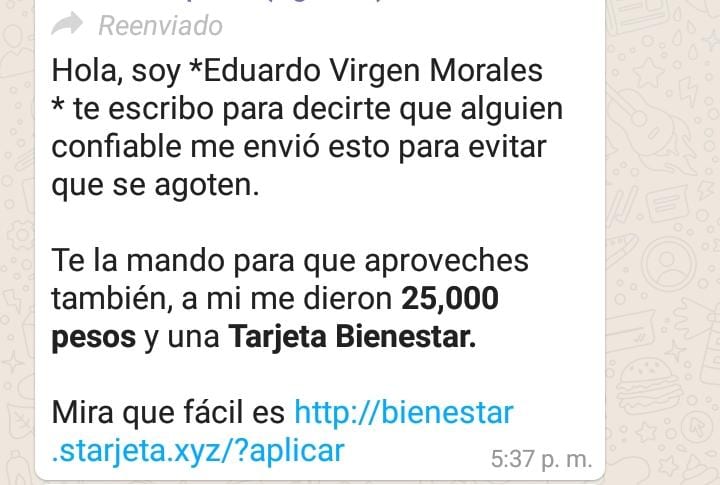 “Hola, soy ——– te escribo para que tu también recibas tu ayuda de parte del 🇲🇽 Gobierno 🇲🇽 , Apresúrate antes de que se agoten esto nos servirá de mucho.Te la mando para que aproveches también, tu Tarjeta Alimentaria de 25,000 Pesos para Todo México”, dice el mensaje. Posteriormente se acompaña por una extraña liga electrónica que invita a dar clic.
