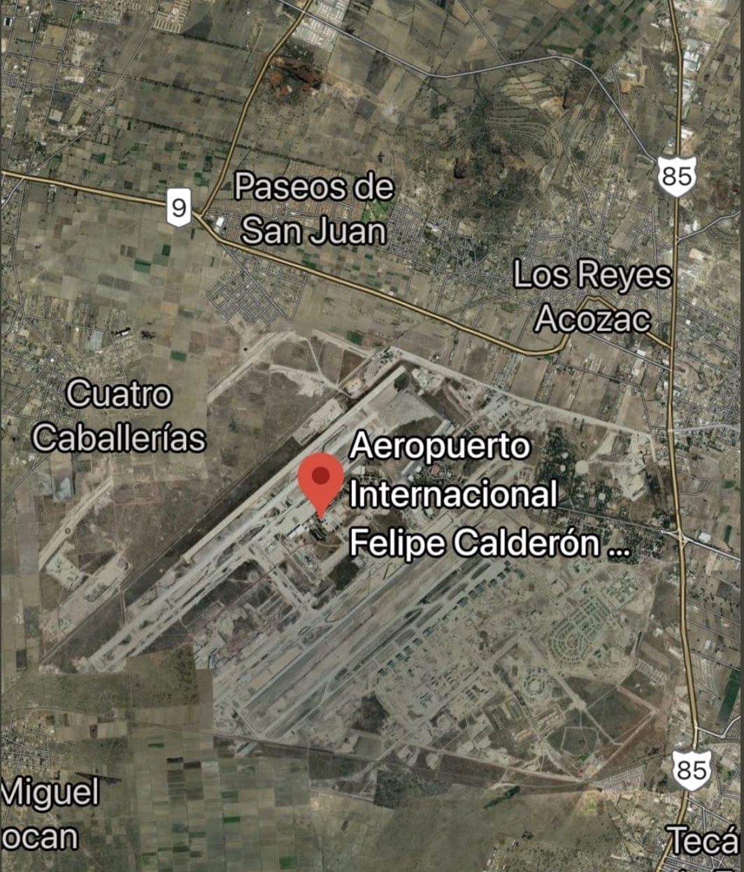 La etiqueta de Google Maps que hace referencia a la terminal aérea Felipe Ángeles apareció con el nombre de Felipe Calderón. Y al picar en dicha ubicación te lleva el efecto a la terminal aérea que construye el Ejército Mexicano.