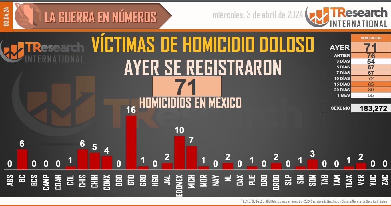 En un análisis reciente de T-ResearchMX titulado ‘MX: La Guerra en Números’, se revela una tendencia preocupante en México: desde el inicio del mandato del presidente Andrés Manuel López Obrador el 1 de diciembre de 2018 hasta el 2 de abril de 2024, se han contabilizado 183 mil 272 homicidios dolosos. Este número surge de los registros combinados de las fiscalías estatales y federales.