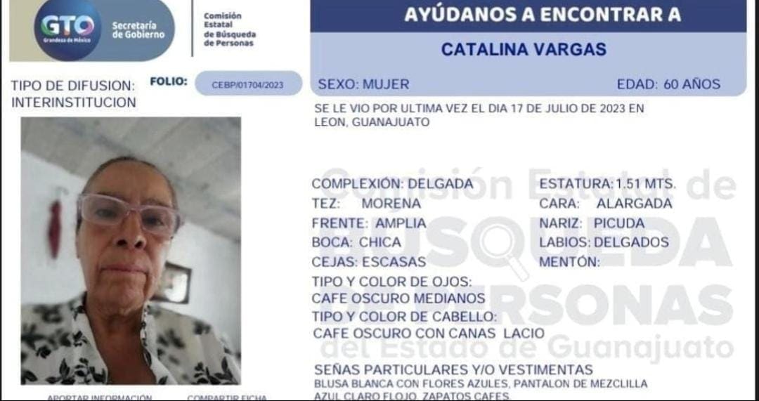 Catalina Vargas, madre buscadora desapareció en León, Guanajuato desde el pasado 17 de julio. Ya fue emitida una ficha de búsqueda por parte de la Fiscalía de dicha entidad.
