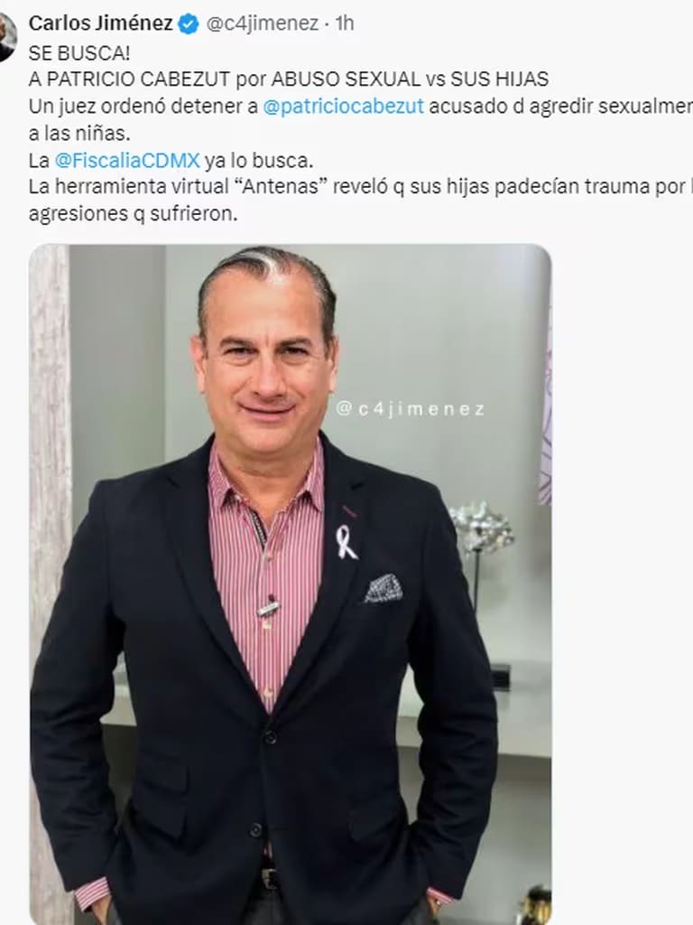El periodista Carlos Jiménez informó que las autoridades están buscando al conductor Patricio Cabezut por presuntos abusos sexuales contra sus hijas. Un juez emitió una orden para que la Fiscalía de la CDMX lo localice. Jiménez divulgó la noticia en X, pero no proporcionó más detalles sobre la denuncia.
