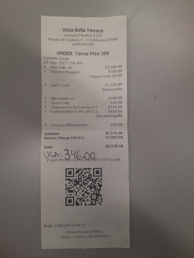 Se trata de un suceso ocurrido en el restaurante Vista Bella Terraza, ubicado en Playas de Tijuana y que cobró a los turistas un 18 por ciento bajo el cargo de servicio el pasado 20 de septiembre.