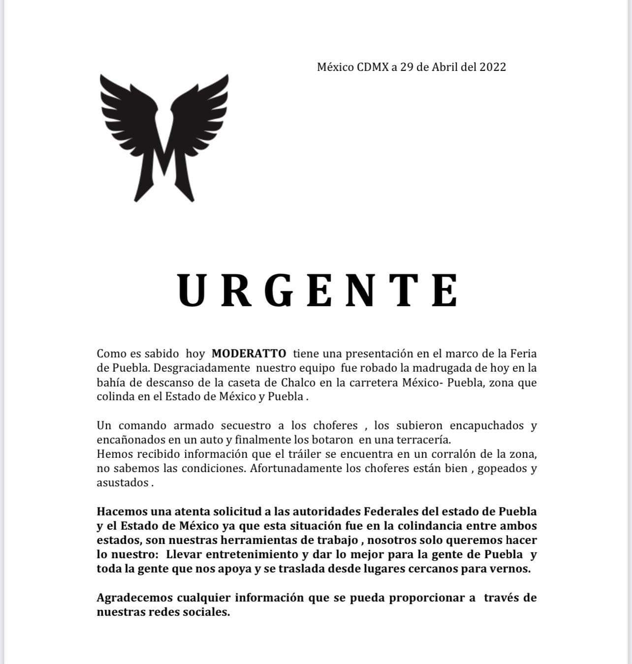 Los músicos de Moderatto piden a las autoridades tanto de Puebla como del Edomex que atiendan esta situación y esperan se resuelva a la brevedad, pues les fue robado su equipo de trabajo cuando iban camino a una presentación, la cual todo apunta que no podrán llevar a cabo.