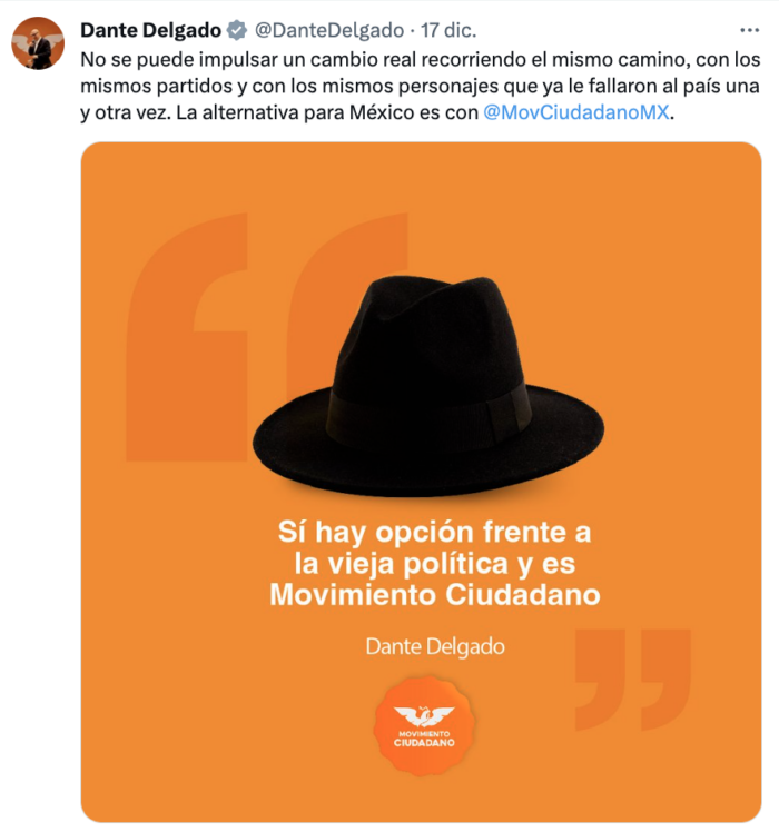 Días antes, Dante Delgado publicó una imagen de su característico sombrero negro y la leyenda: