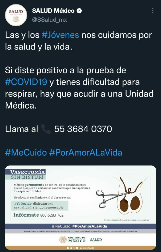 Fue hace unas horas cuando un tuit de la Secretaría de Salud Federal en el que se invitaba a cuidarse del Covid-19 se viralizó. Y es que el texrto era acompañado por una imagen que no tenía nada que ver con la pandemia, ¡hablaba de la vasectomía!