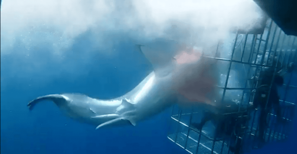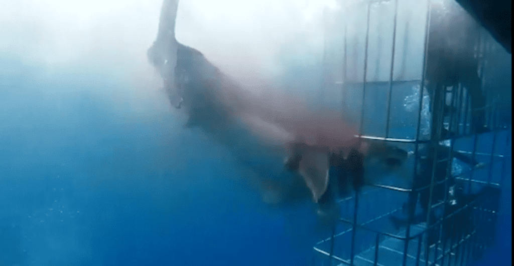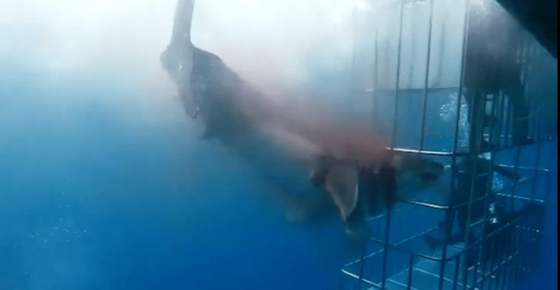 Un video muestra cómo un tiburón blanco muere atorado en una jaula de turistas donde la agonía del escualo dura cerca de media hora.