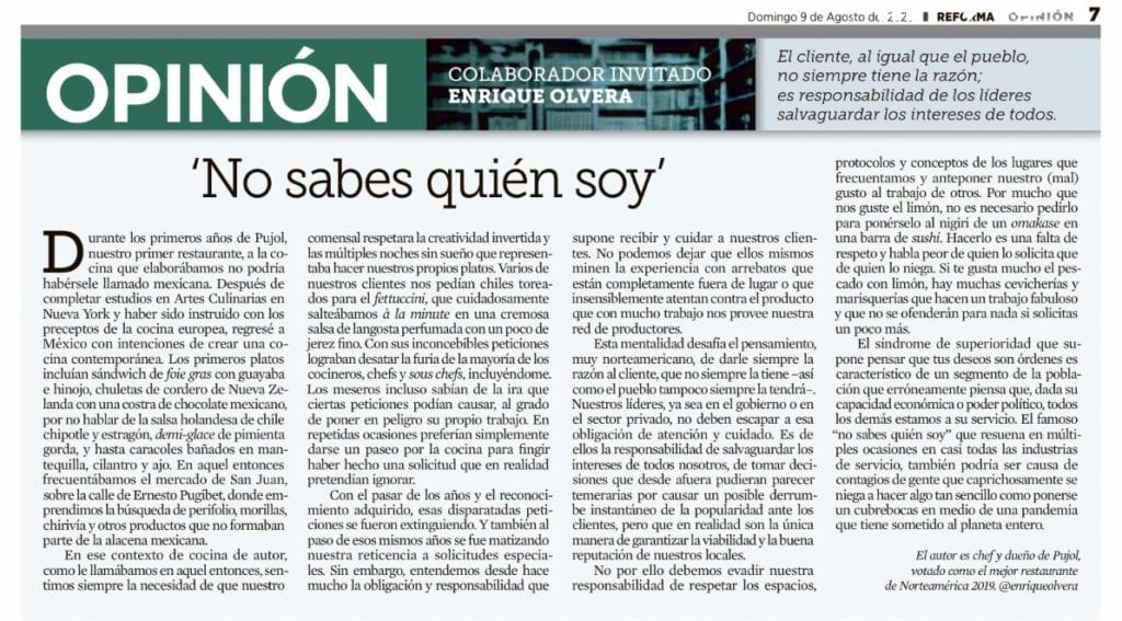 Y es que para comenzar el chef afamado y premiado por su restaurante Pujol, doce que “el cliente no siempre tiene la razón”, una de las muchas cosas que puso enojados a los cibernautas. “El texto de Enrique Olvera es un Frankenstein de muchas ideas acomodadas a la fuerza, hasta pareciera que sólo un par de párrafos fue escrito por él. Ojalá nos contara un poco más de las demandas que tiene en su contra en el restaurante Cosme, en Nueva York”, asegura La Warrior.