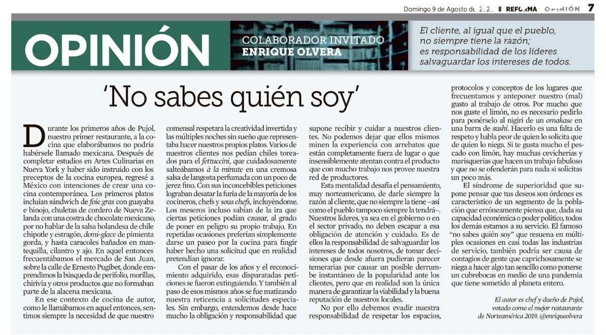Pero la mejor crítica la tiene el lector de Quinta Fuerza, por lo que lo invitamos a reflexionar sobre esta columna, que hizo enojar a muchas personas y a otras más que están de acuerdo con el Chef Olvera, las invitó a reflexionar.