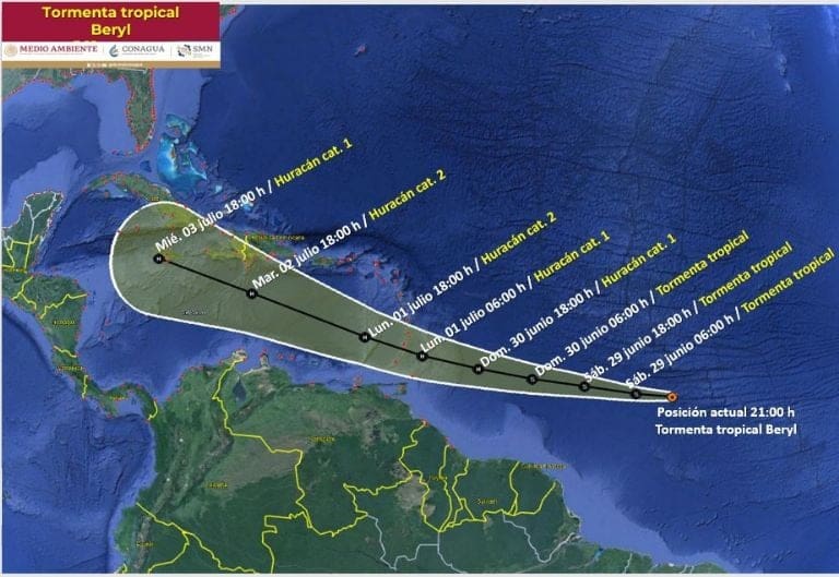 De acuerdo con el Servicio Meteorológico Nacional, Beryl continuará desplazándose hacia el oeste a una velocidad promedio de 37 km/h, manteniendo una trayectoria que podría afectar eventualmente las costas de Quintana Roo y Yucatán.