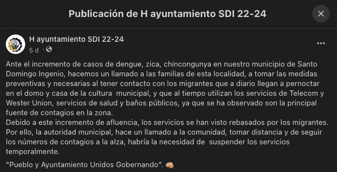 Y es que en el texto se pidió a las familias de la localidad “tomar distancia, medidas preventivas y necesarias” al tener contacto con las personas migrantes que se refugian en los espacios públicos de la localidad.
