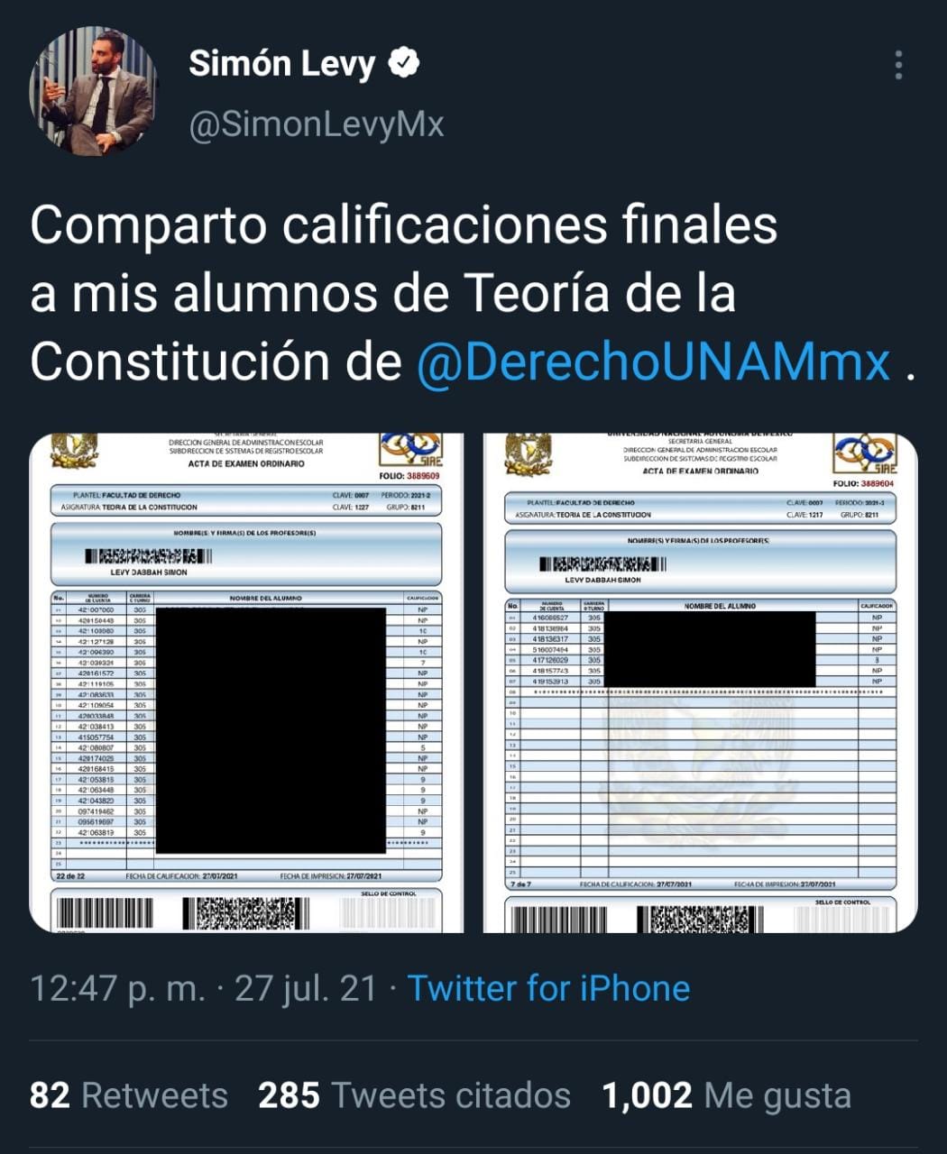 Este es el tuit que desencadenó todo, y que a esta alturas ya fue borrado por Simón Levy. En el post compartía dos imágenes donde se podían ver las calificaciones de los alumnos y los números de cuenta, que es una manera de identiifcar a los estudiantes.