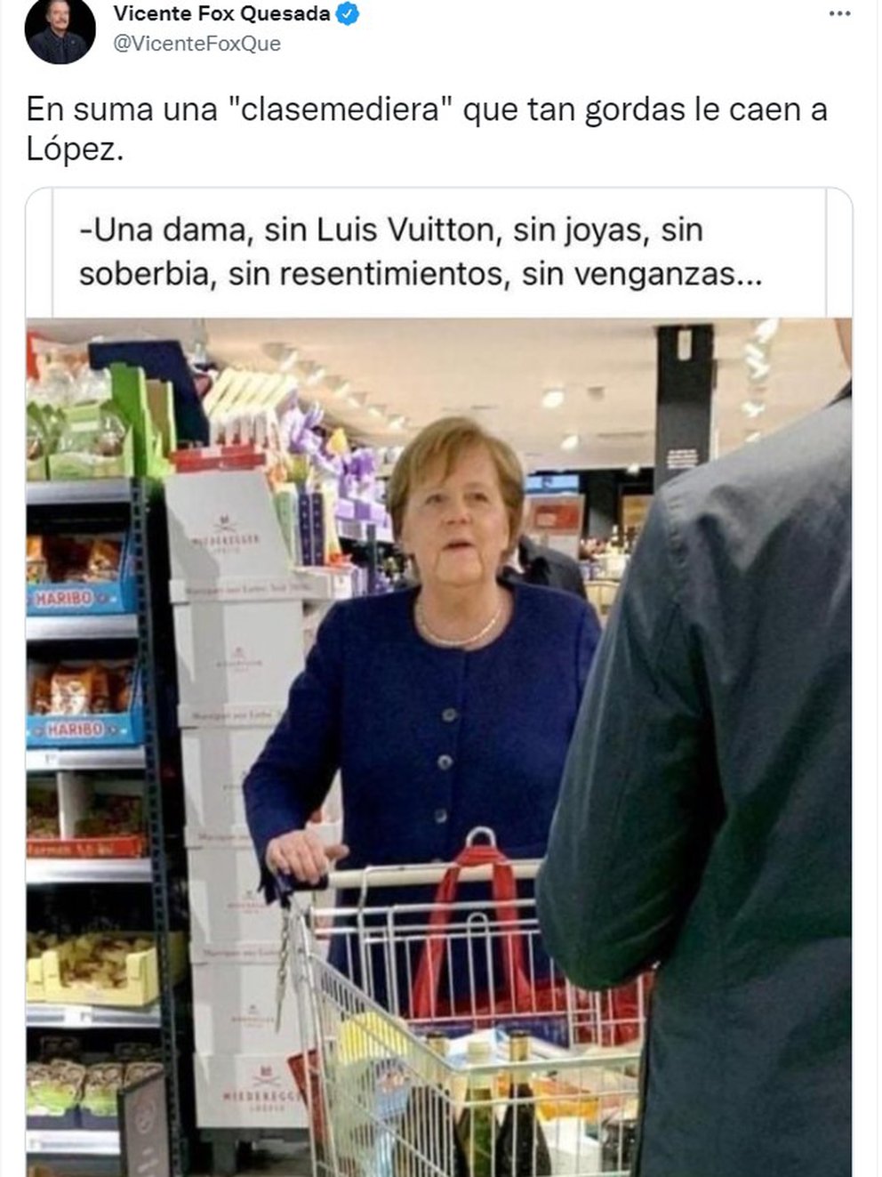 Por ello, Vicente Fox tomó una fotografía famosa política de Angela Merkel, canciller alemana, previo a la pandemia mundial por la enfermedad COVID-19, cuando asistió a un supermercado por cuenta propia para realizar sus compras.