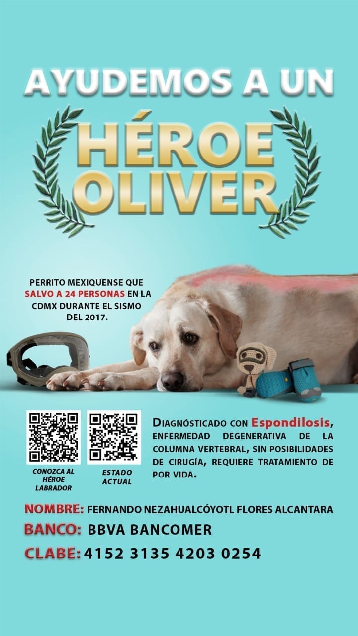 Por tanto el comandante que fundó en 2009 la Unidad Canina de Seguridad Pública de Texcoco, Fernando Netzahualcoyotl Flores Alcántara y propietario de “Oliver”, ha pedido apoyo para ayudar a este labrador que en ese catastrófico 19S, trabajó con rescatistas trabajó aún con una lesión en la columna vertebral.