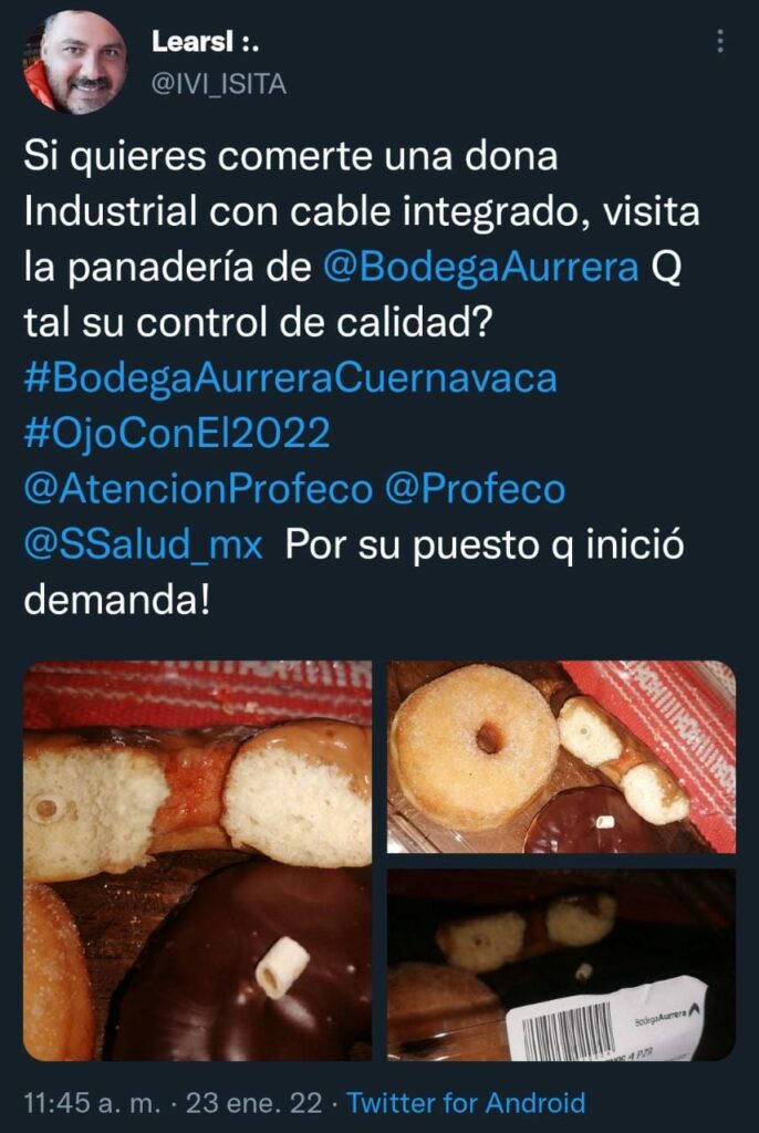 Un cliente acudió hace unos días a un Bodega Aurrera en la ciudad de Cuernavaca, Morelos y tremenda fue su sorpresa al descubrir que en las donas que había comprado aparecía lo que parece ser un pedazo de cable.