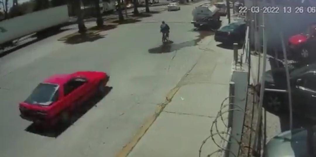 El incidente fue dado a conocer mediante un video compartido en redes sociales, en el que vemos a un ciclista que va pedaleando cuando de repente un automóvil de color rojo pasa a toda velocidad y se lo lleva “de corbata” lanzándolo por los aires. El imprudente automovilista además escapó del sitio del percance.