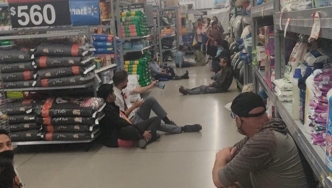 Donde pudo la gente intentó resguardarse para no recibir un disparo. Como estos chiapanecos que se tiraron al piso en el Walmart de San Cristóbal de las Casas, Chiapas.