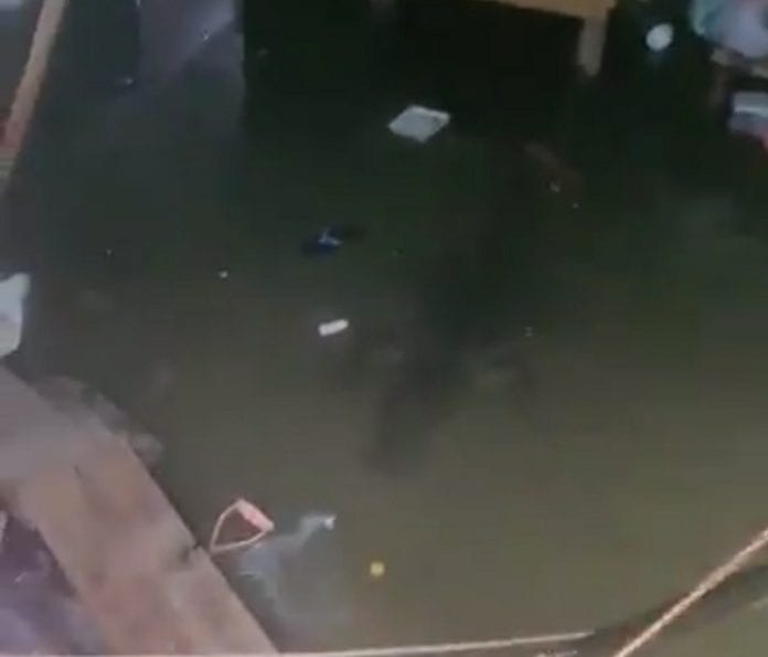 Entre gritos, el cocodrilo nada en el primer piso de una casa con muebles arrumbado y otros flotando en el agua. Segundo después se logra captar a otro cocodrilo que nadaba debajo del agua.