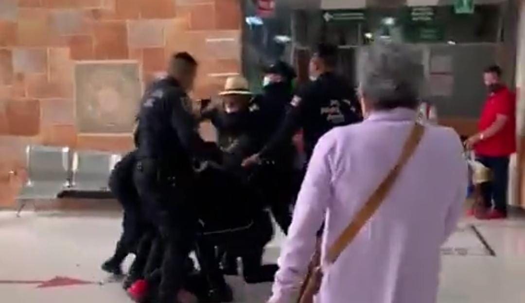 Al principio hay un elemento de la Guardia Nacional que tiene en el piso al derechohabiente y otros dos que sostienen al papá. Cuando el papá comienza a pedir a gritos que dejen en paz a su hijo, lo mismo que los presentes, y cuando el hijo intenta incorporarse, llegan aún más elementos de la Guardia Nacional. Incluso uno saca su macana y al parecer sí golpea a padre e hijo.