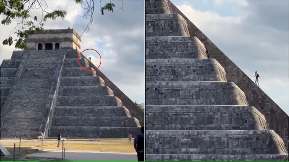 A través de redes sociales fue compartido el momento en el que se observa al individuo de 38 años de edad subir la pirámide y luego esconderse para burlar la seguridad del sitio que corrieron detrás de él.