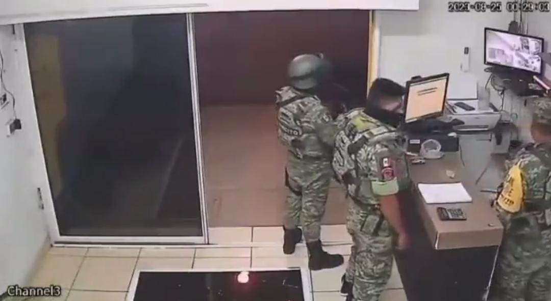 De acuerdo con lo que nos permiten ver las imágenes, el dependiente de la tienda comienza a hablar con alguien que está del otro lado de la puerta, y después se ve cómo una mano intenta abrir la puerta. Posteriormente unos siete u ocho soldados, algunos de ellos armados y encapuchados, derriban la puerta.