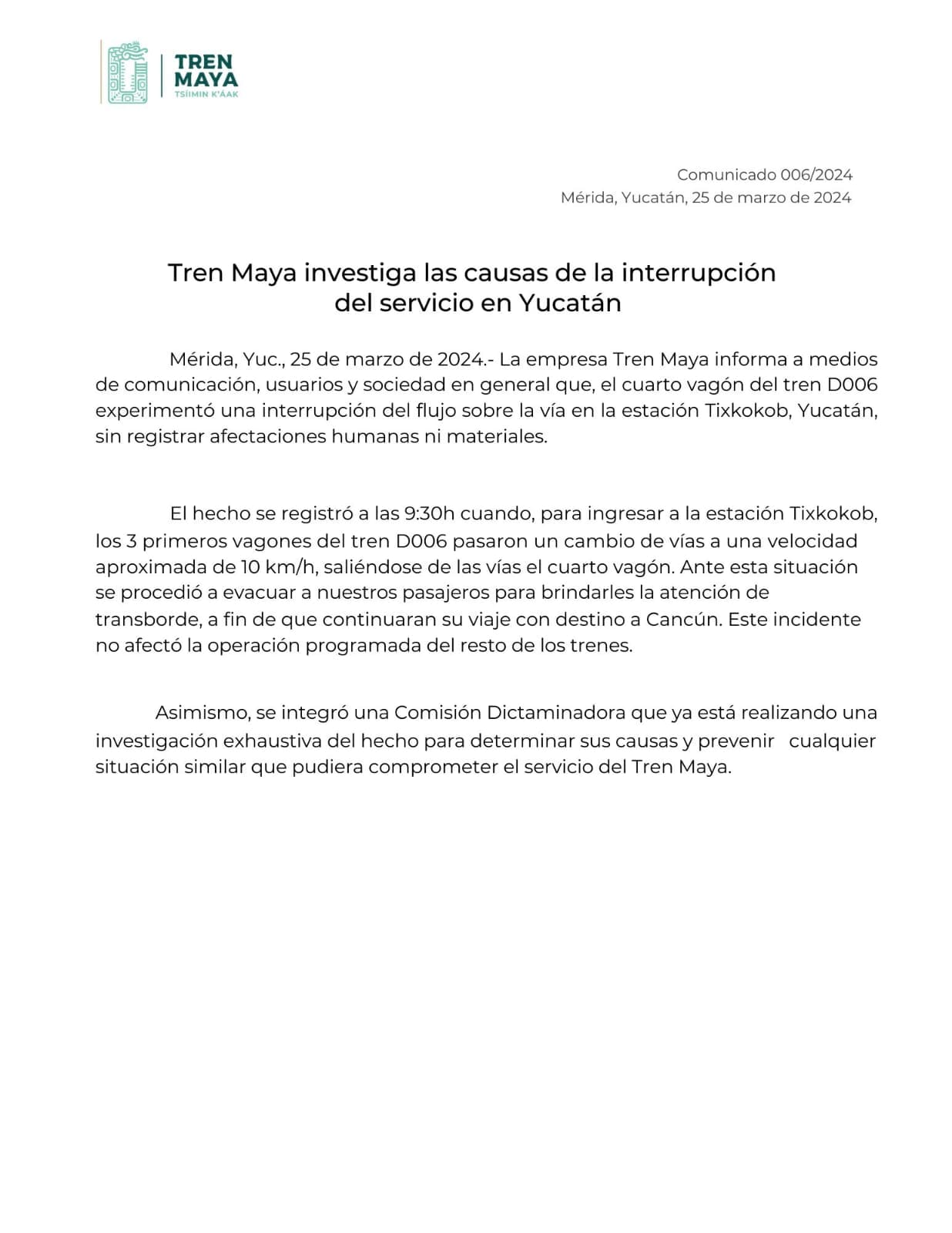 Sin duda que este nuevo incidente del Tren Maya seguirá dando de qué hablar en los próximos días. Habrá que esperar las conclusiones de la comisión investigadora.