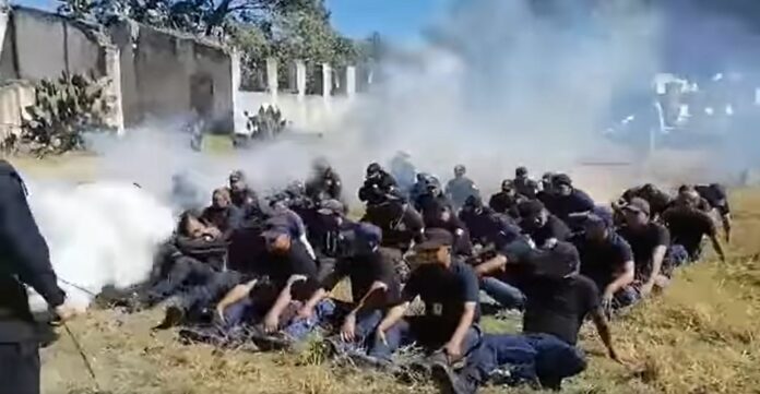 Tlaxcala.- Un elemento de la Policía Estatal se desmayó y otros salieron corriendo luego de hacer un entrenamiento con gas lacrimógeno, en un video difundido en redes sociales se ve el entrenamiento de los uniformados.