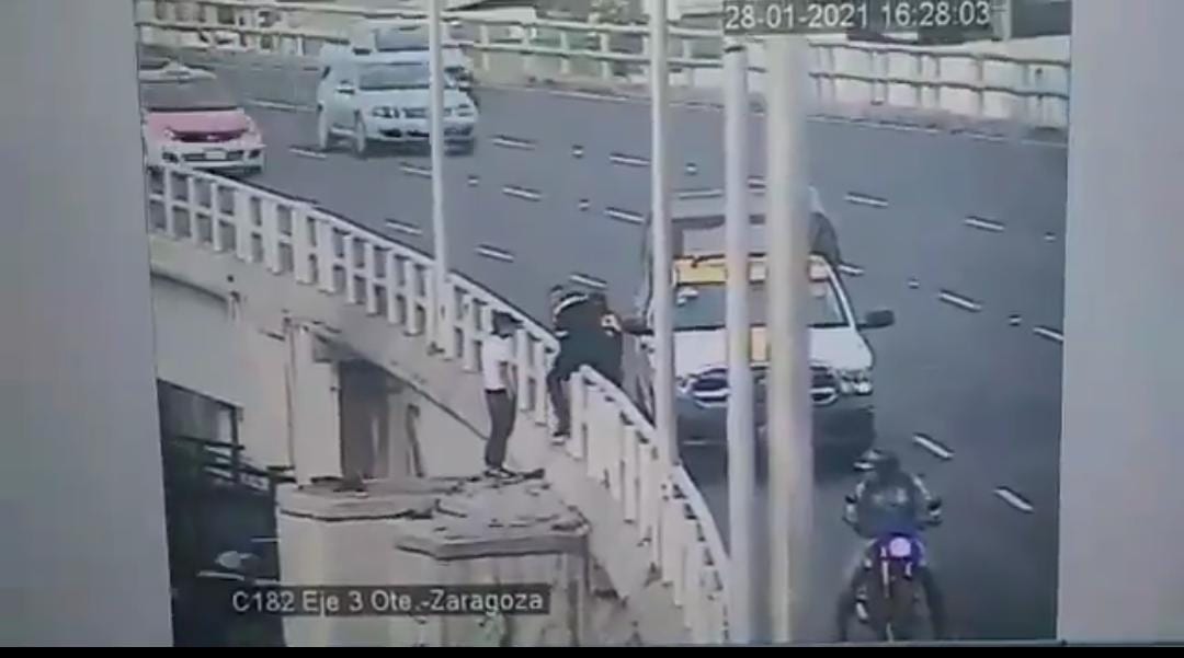 Lo que contamos sucedió ayer jueves en la Cdmx, donde cerca de las 4:28 pm hora del centro de México, las cámaras de videovigilancia pudieron captar a un sujeto, el cual al parecer pensaba arrojarse desde lo alto del distribuidor vial Heberto Castillo. Son aproximadamente 15 metros de altura, por lo quizá no hubiera sobrevivido la caída.