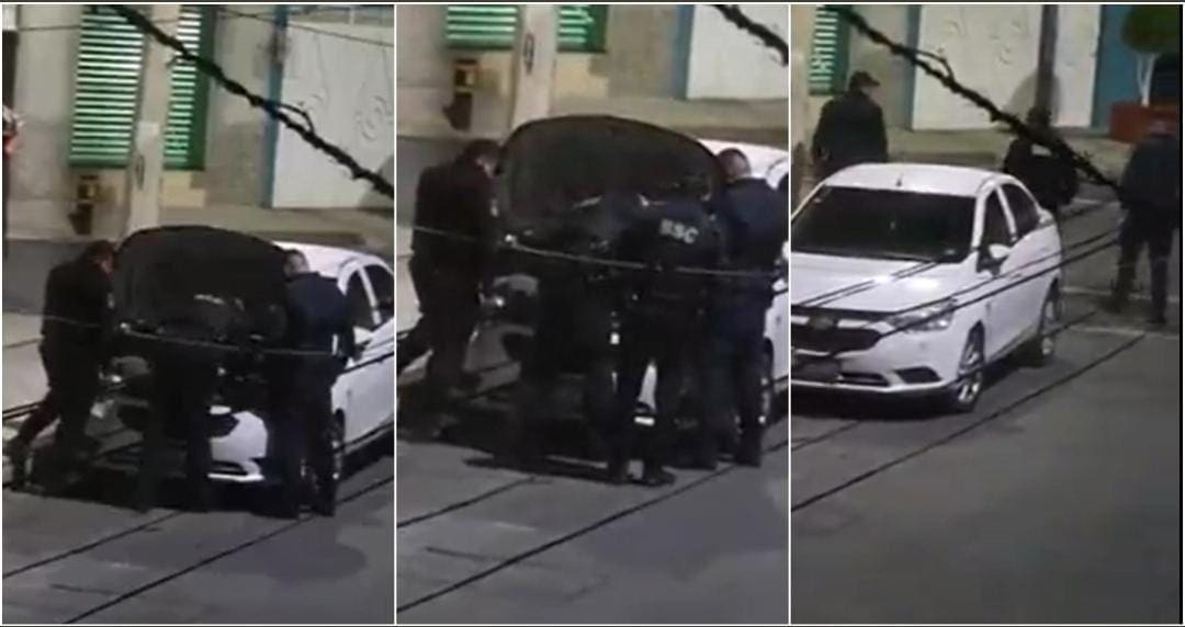 Por lo que alcanzamos a ver pareciera que uno de los presuntos policías está intentando llevarse la batería del automóvil, mientras los otros dos uniformados se encuentran parados de pie a los costados del vehículo.