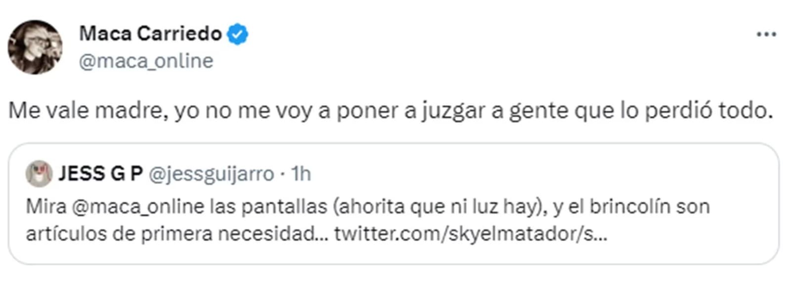 Aunado a ello, la comunicadora Maca Carriedo mostró su solidaridad con las personas que “perdieron todo”. “Me vale madre, yo no me voy a poner a juzgar a gente que lo perdió todo”.