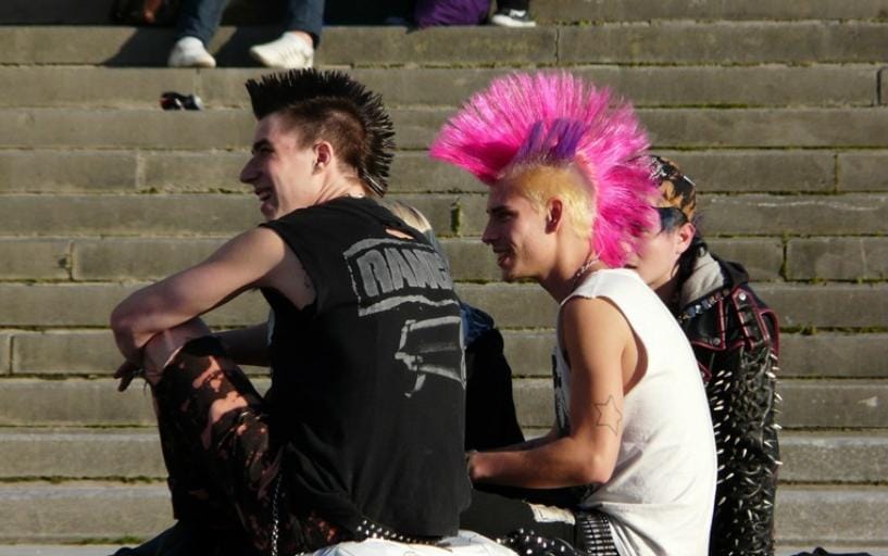 Por el otro lado estaban los punks. Se decían independientes y contraculturales. Eran seguidores del movimiento musical surgido en los 70 con bandas como Sex Pistols, The Clash y estadounidenses como Ramones. Ellos usaban mohicanos a veces teñidos de colores llamativos; calzaban botas estilo militar, cadenas en los pantalones y chamarras de cuero negro.