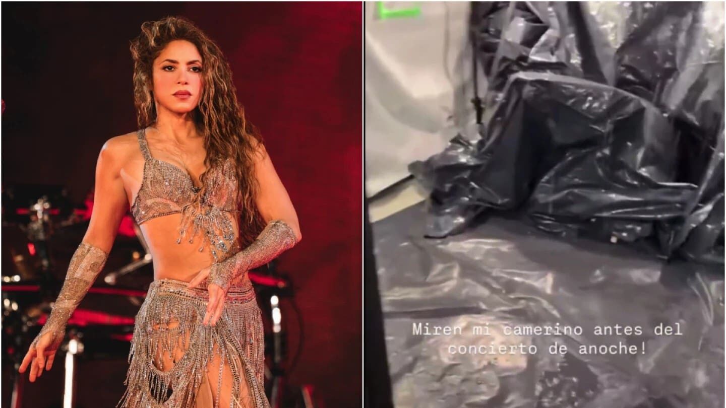 En el video se puede apreciar el interior de camerino de Shakira cubierto con bolsas negras y grandes filtraciones de aguas en los costados.
